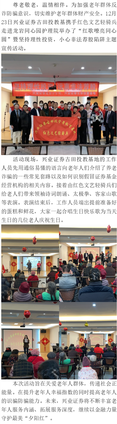 【兴·风采】兴业证券古田投教基走进龙岩同心圆护理院开展“红歌喷亮同心圆”暨坚持理性投资,小心非法荐股陷阱主题宣传活动