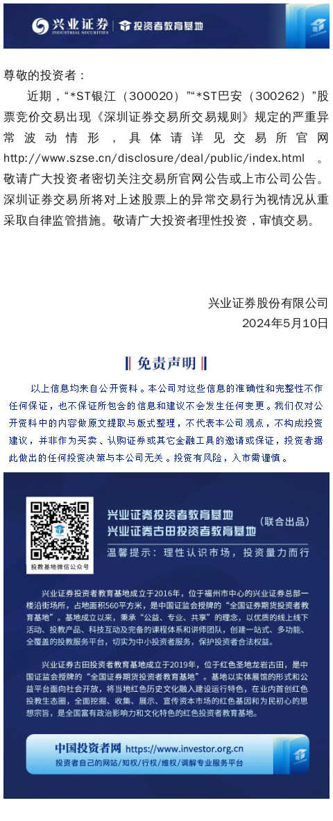 【兴·公告】关于“*ST银江(300020)”“*ST巴安(300262)”严重异常波动股票交易的风险提示