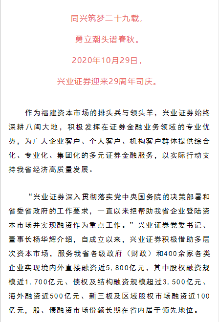【兴业证券29周年司庆】同兴筑梦二十九载, 勇立潮头谱春秋!