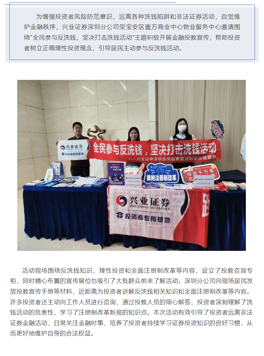【兴·风采】兴业证券深圳分公司开展“全民参与反洗钱,坚决打击洗钱活动”投教宣传工作