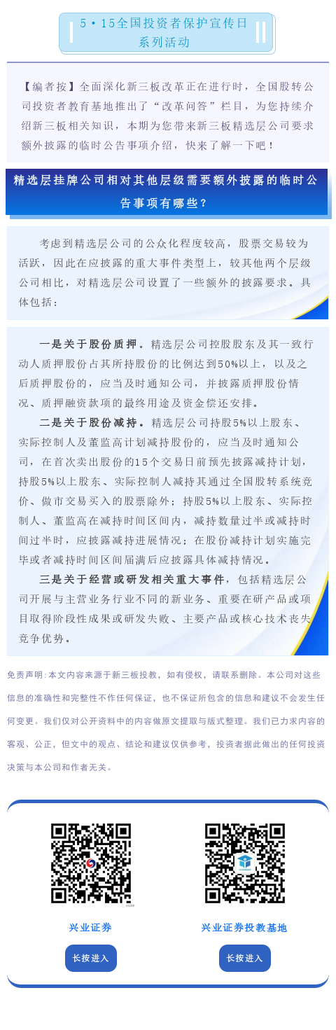 【投教·新三板新风】改革问答 | 第二十期:精选层挂牌公司相对其他层级需要额外披露的临时公告事项有哪些?