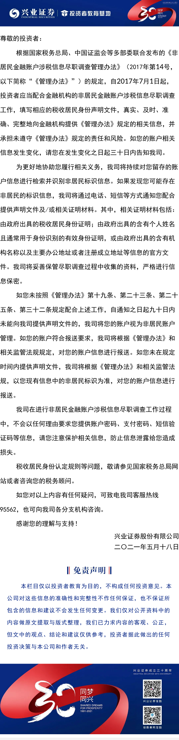 【兴·公告】关于持续实施《非居民金融账户涉税信息尽职调查管理办法》的公告
