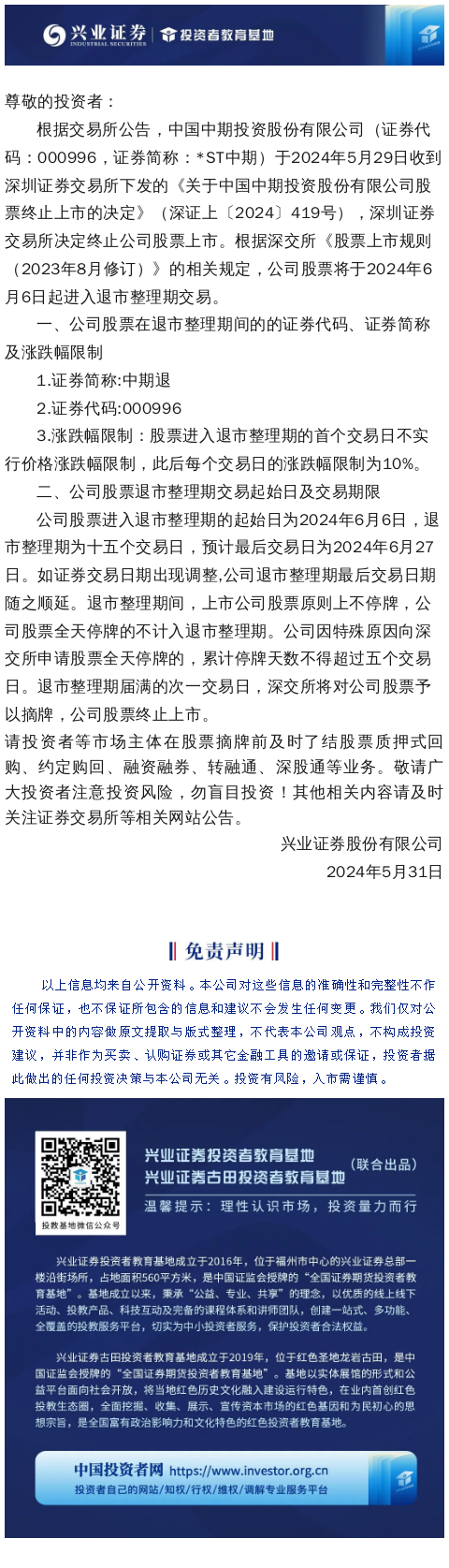 【兴·公告】000996 *ST中期 关于公司股票终止上市并进入退市整理期交易的公告
