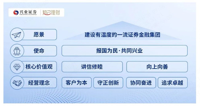 兴业证券企业文化理念体系以“建设有温度的一流证券金融集团”为愿景,以“报国为民,共同兴业”为使命,以“讲信修睦,向上向善”为核心价值观,以“客户为本、守正创新、协同奋进、追求卓越”为经营理念。