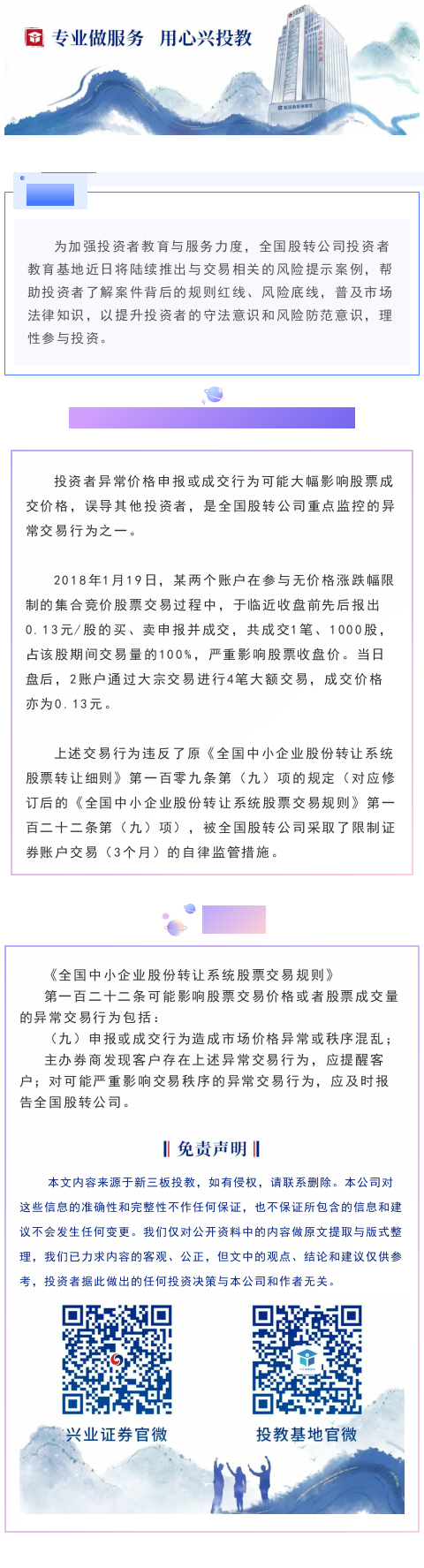 【新三板】风险提示案例 | 某两个账户异常价格申报、成交违规案例
