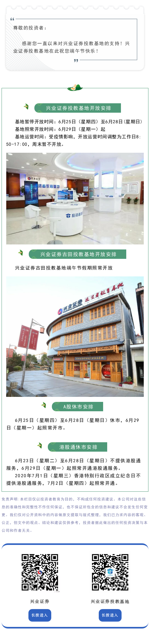 【投教·兴公告】兴业证券投教基地端午节开放安排以及A股休市、港股通交易日安排