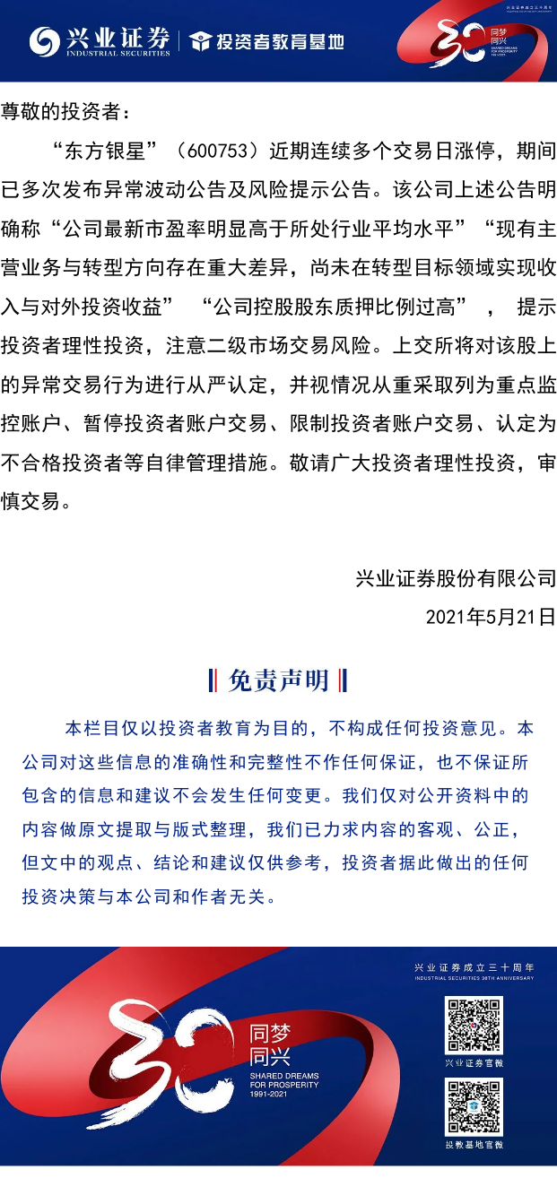 【兴·公告】关于“东方银星”(600753)股票交易的风险提示