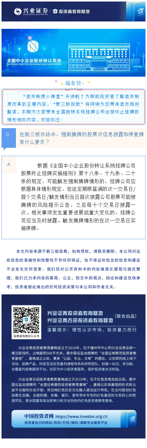 【兴·分享】退市制度小课堂 | 第九期:在新三板市场中,强制摘牌的股票对信息披露和停复牌有什么要求?