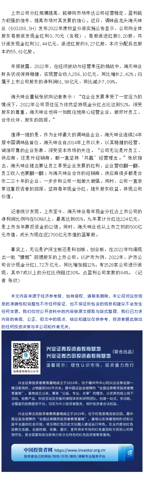 媒体视角 | 海天味业:九年分红累计超200亿元