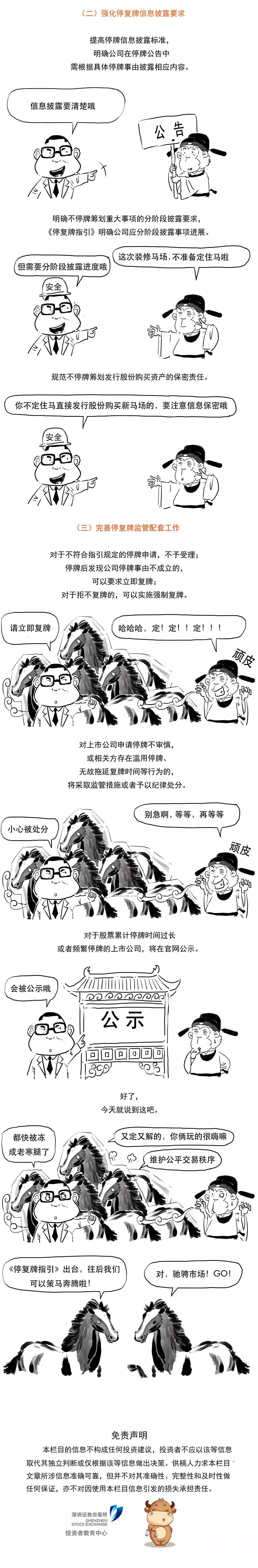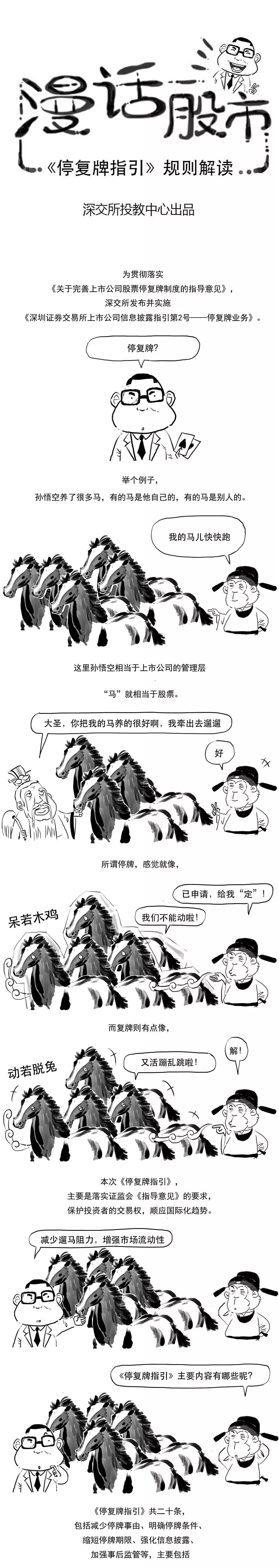 编者按:为了帮助投资者理解《深圳证券交易所上市公司信息披露指引第2号——停复牌业务》,加强规则宣传,我们制作了漫画《<停复牌指引>规则解读》,一起看看吧!