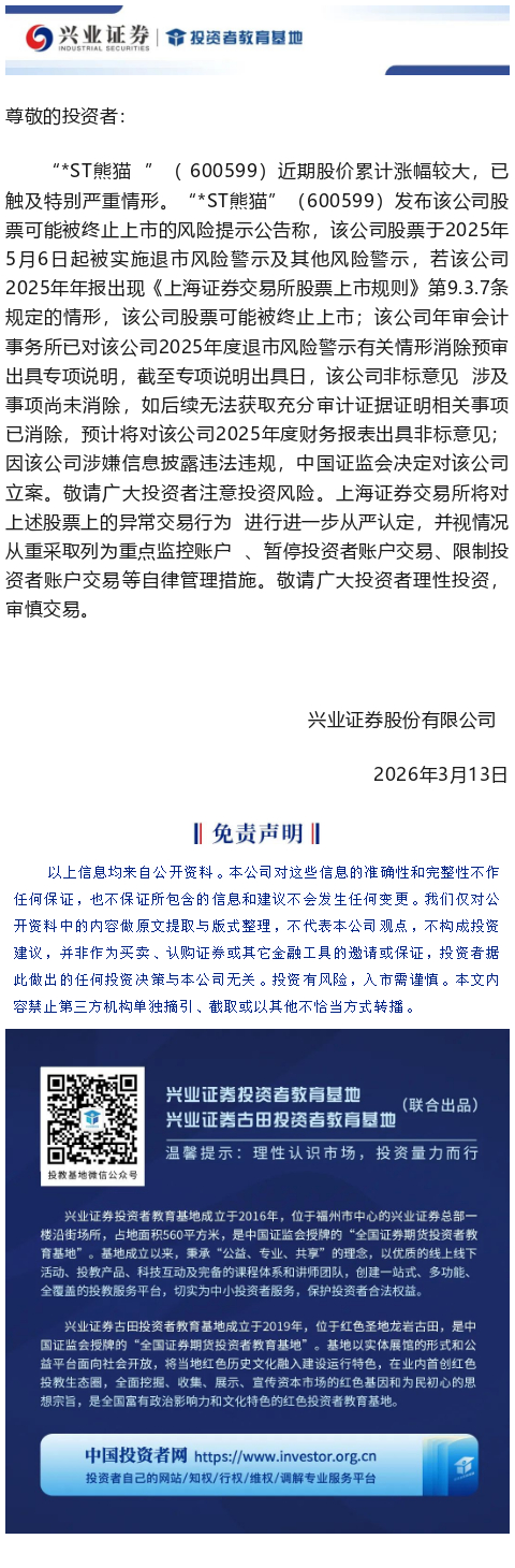 【兴·公告】关于上交所“*ST熊猫”(600599)重点监控证券交易的风险提示(2026-03-13 10:05:56.0)