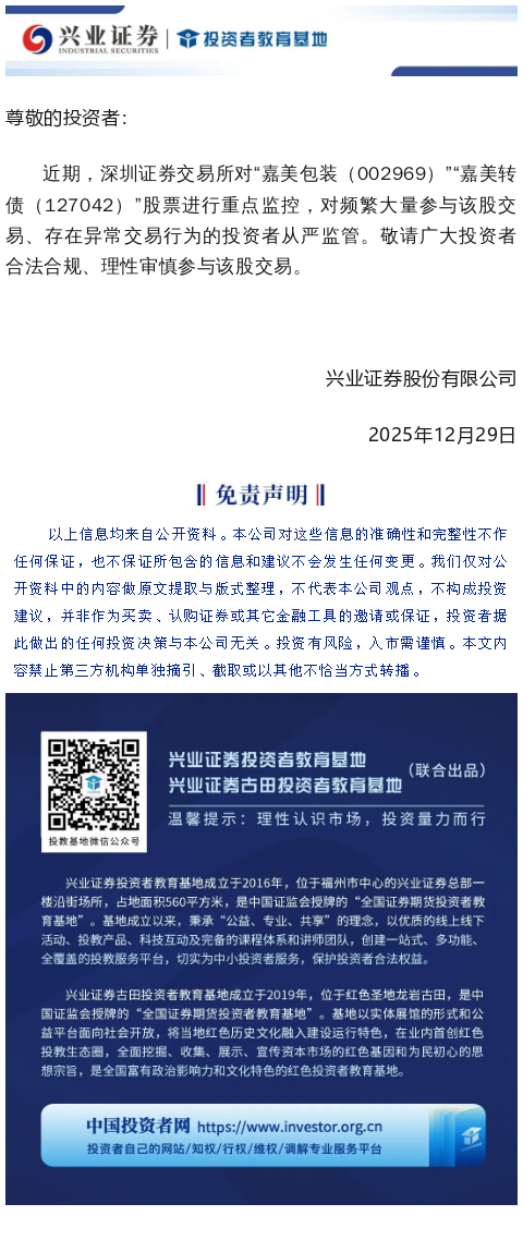 【兴·公告】关于深交所“嘉美包装(002969)”“嘉美转债(127042)”重点监控证券交易的风险提示