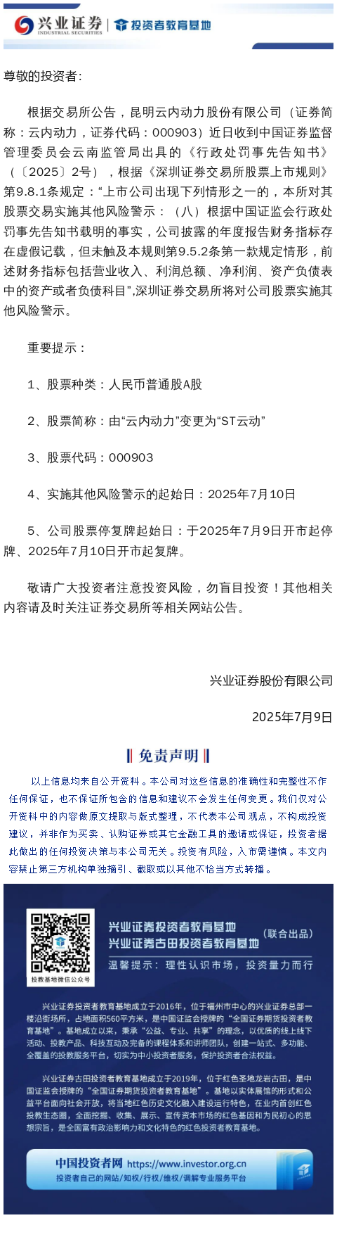 【兴·公告】000903 云内动力 关于公司股票交易被实施其他风险警示暨股票停复牌的提示性公告