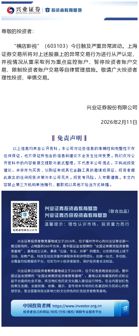 【兴·公告】关于上交所“横店影视”( 603103)重点监控证券交易的风险提示(2026-02-11 15:56:36.0)