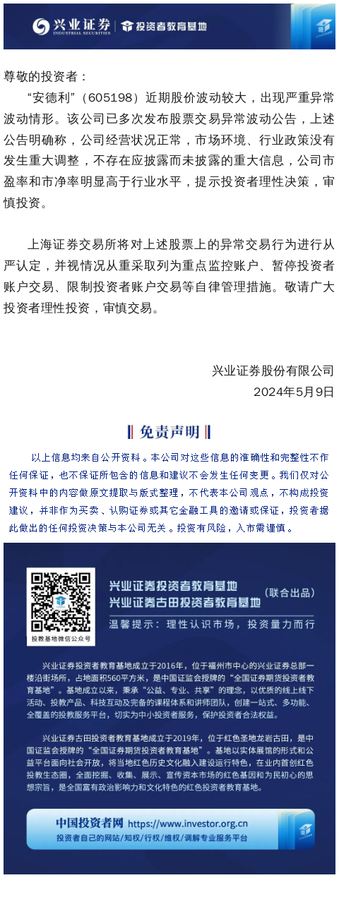 【兴·公告】关于“安德利”(605198)重点证券交易的风险提示