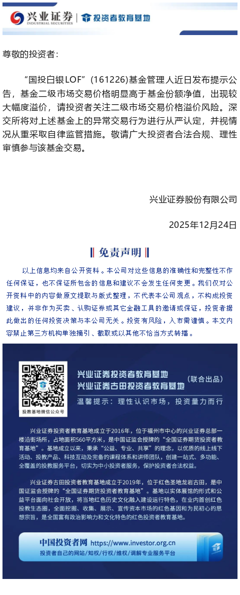 【兴·公告】关于深交所“国投白银LOF”(161226)重点监控证券交易的风险提示