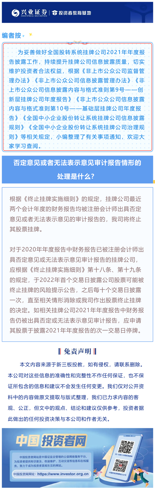 【兴·分享】挂牌公司年报系列 | 第五期:否定意见或者无法表示意见审计报告情形的处理是什么?