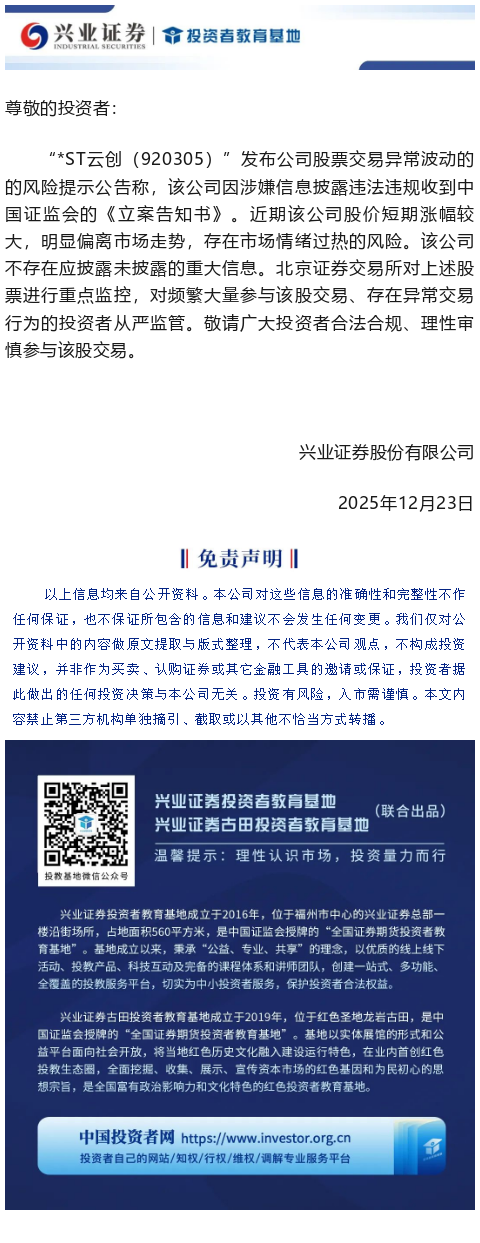 【兴·公告】关于北交所“*ST云创(920305)”重点监控证券交易的风险提示