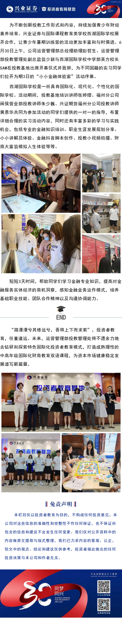 【兴·风采】兴业证券投教工作深入国际校园,倍受外籍同学欢迎 ——与西湖国际学校开展“小小金融体验家”活动