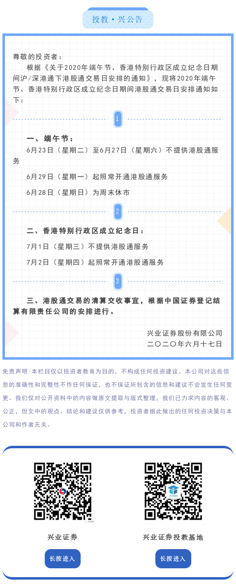 【投教·兴公告】关于2020年端午节、香港特别行政区成立纪念日期间沪/深港通下港股通交易日安排的通知