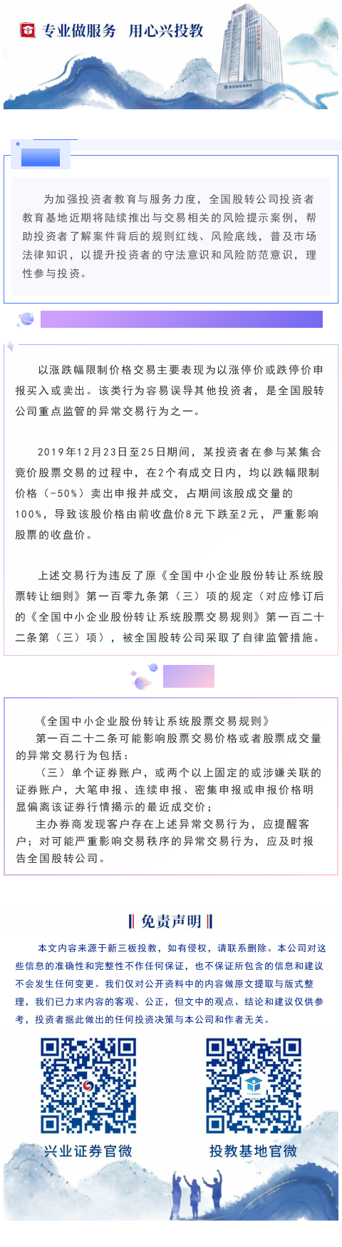 【新三板】风险提示案例 | 某投资者多次以跌幅限制价格申报、成交违规案例