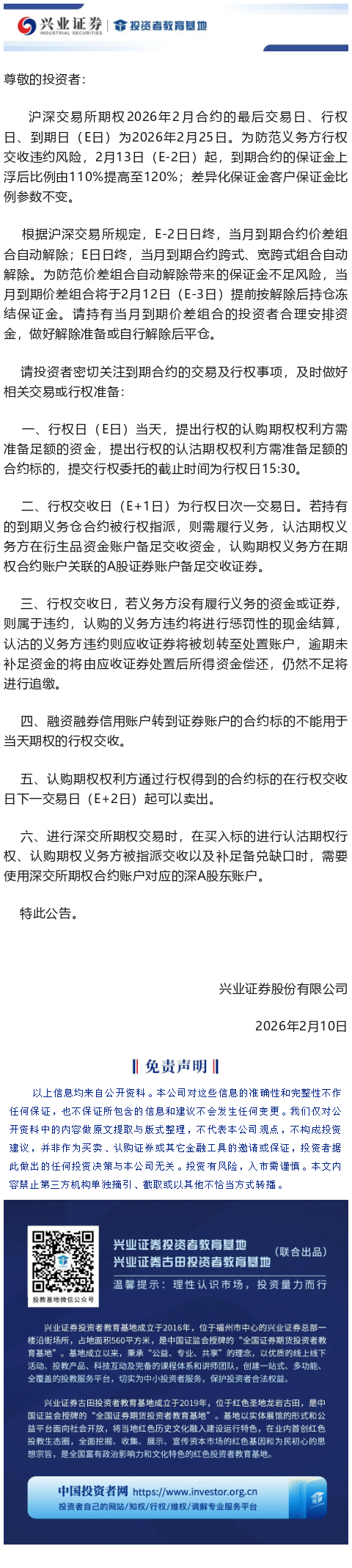 【兴·公告】关于2026年2月ETF期权临近到期合约保证金调整、组合解除与行权交收提醒的公告(2026-02-10 15:57:47.0)