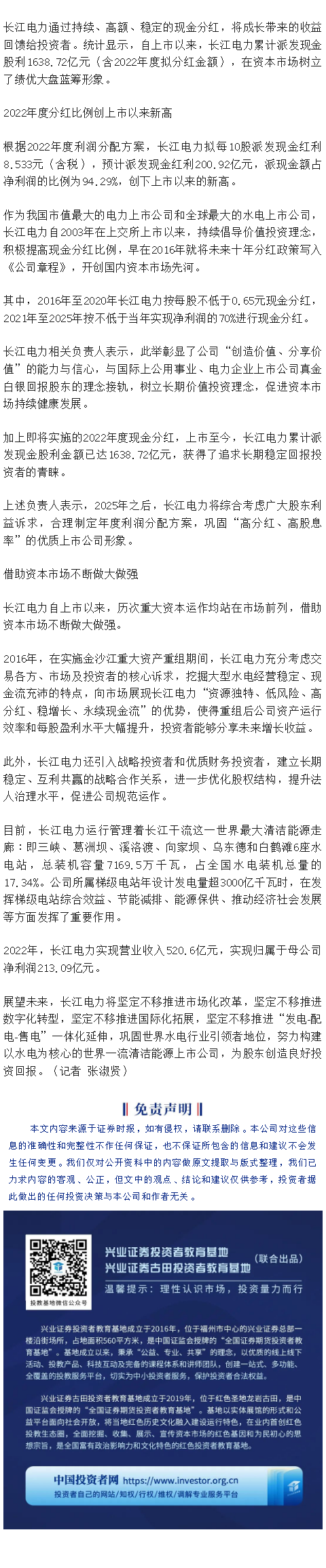 【兴·分享】媒体视角 | “沪市高分红公司巡览”第5期——长江电力:上市以来累计分红超1600亿元 树立绩优大盘蓝筹形象