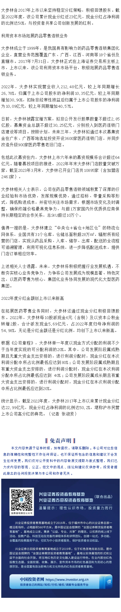 【兴·分享】媒体视角 | “沪市高分红公司巡览”第4期——大参林:上市以来累计分红近23亿元 占净利润比重达50%