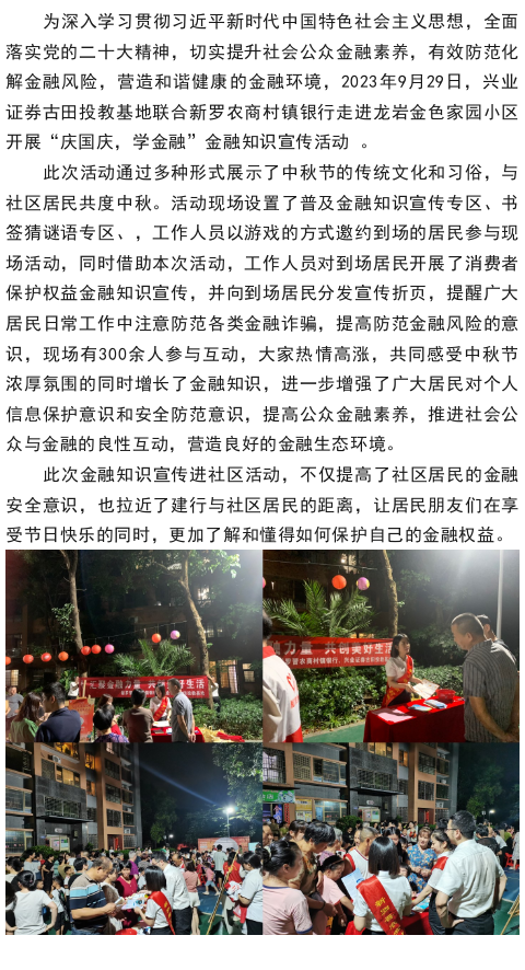 【兴·风采】兴业证券古田投教基地联合新罗农商村镇银行走进龙岩金色家园小区开展“庆国庆,学金融”金融知识宣传活动