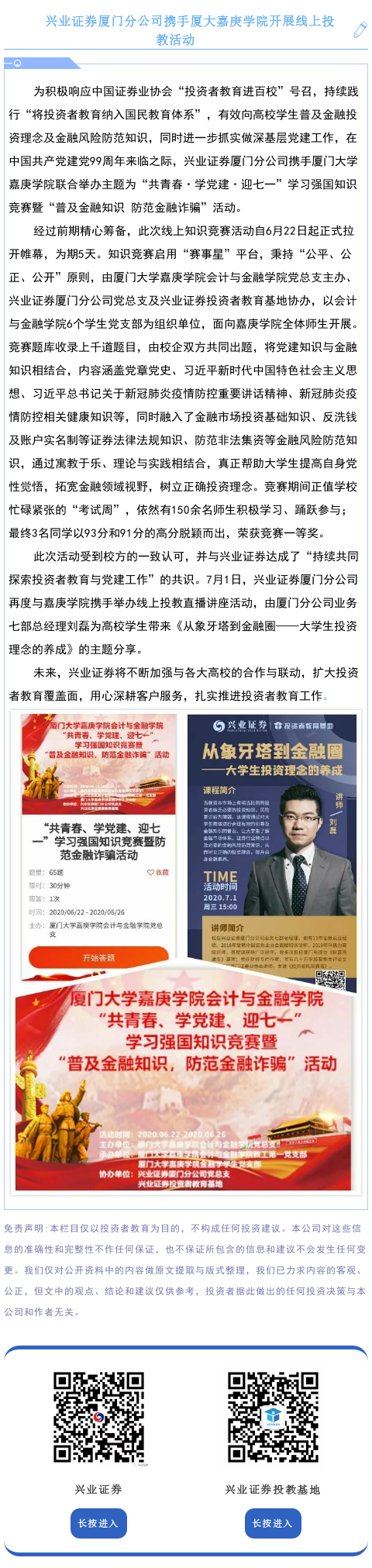 【投教·国民教育活动】厦门分公司携手厦大嘉庚学院开展线上投教活动