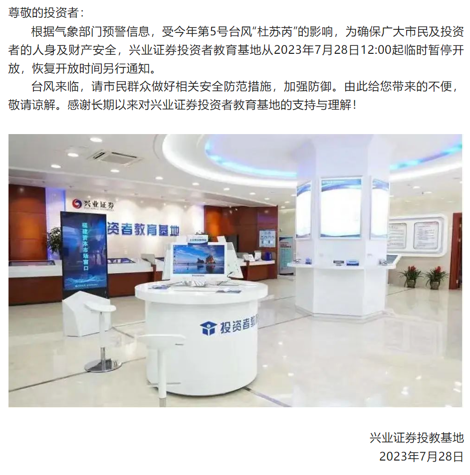 【兴·公告】关于兴业证券投教基地暂停开放的公告