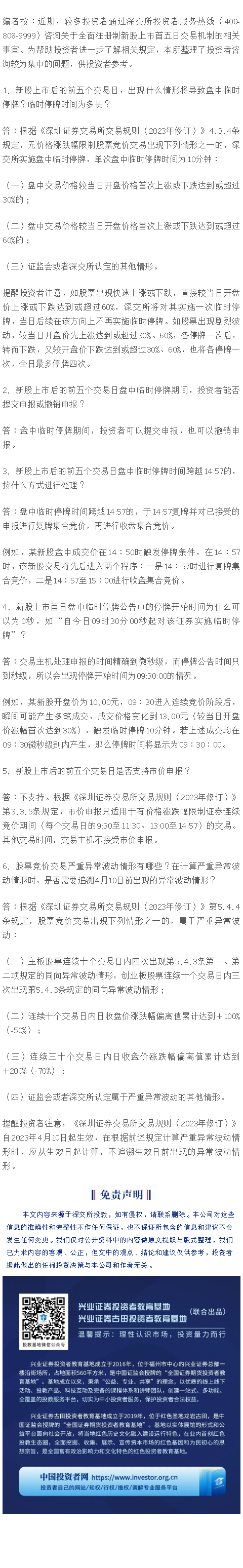 【兴·分享】深交所投教 | 投资者服务热线问答(2023年第9期)关于全面注册制新股上市首五日交易机制(下)