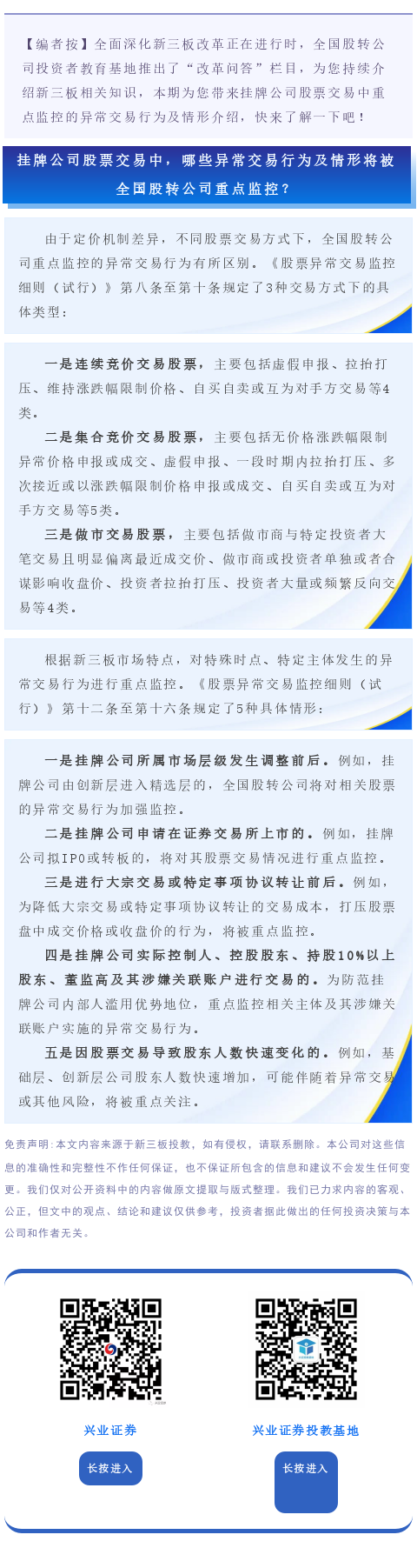 【投教·新三板新风】改革问答 | 第二十七期:挂牌公司股票交易中,哪些异常交易行为及情形将被全国股转公司重点监控?