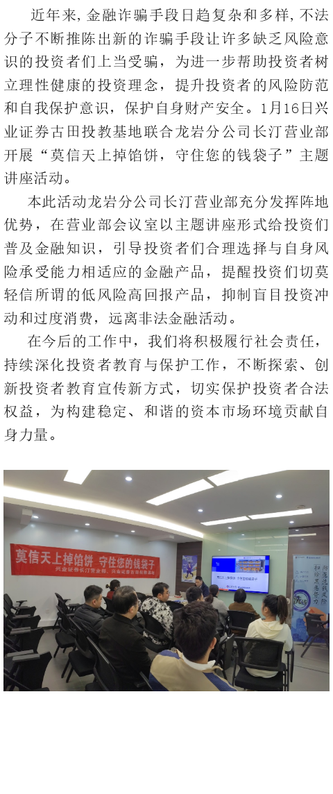 [兴·风采]兴业证券古田投教基地联合龙岩分公司长汀营业部开展“莫信天上掉馅饼,守住您的钱袋子”主题讲座活动