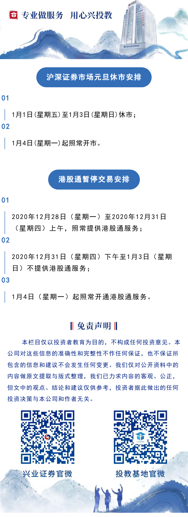 【兴·公告】元旦沪深市场、港股通休市安排