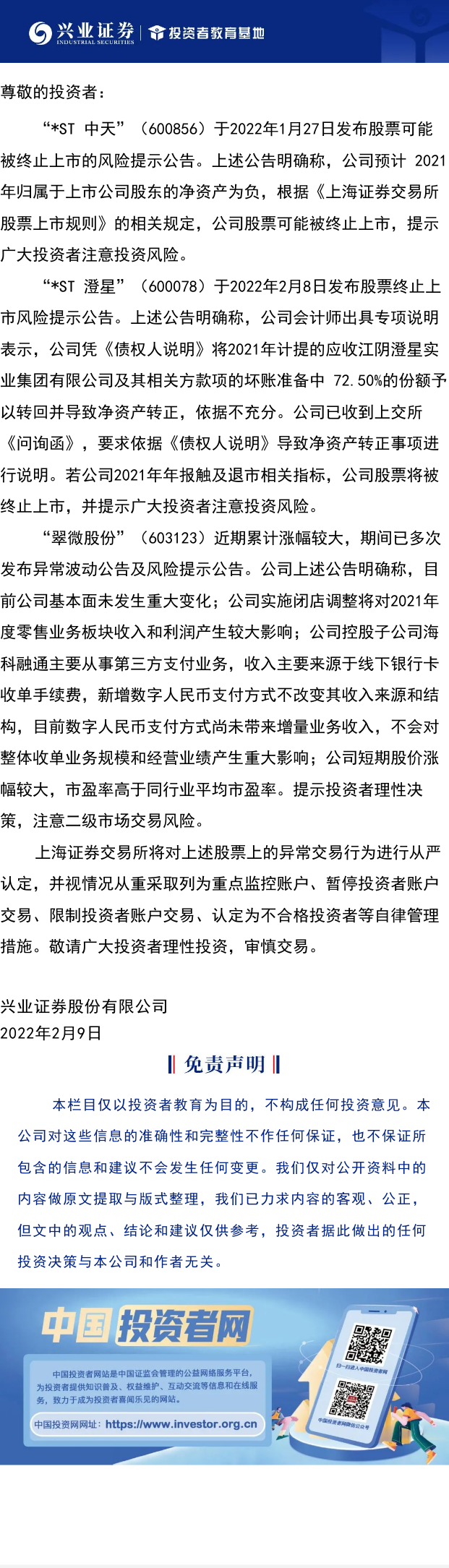 【兴·公告】关于“*ST 中天”(600856)“*ST 澄星”(600078)“翠微股份”(603123)股票交易的风险提示