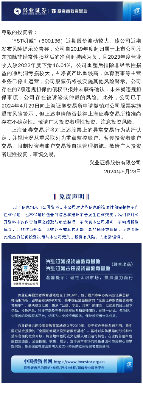 【兴·公告】关于上交所“*ST 明诚”(600136)重点证券交易的风险提示