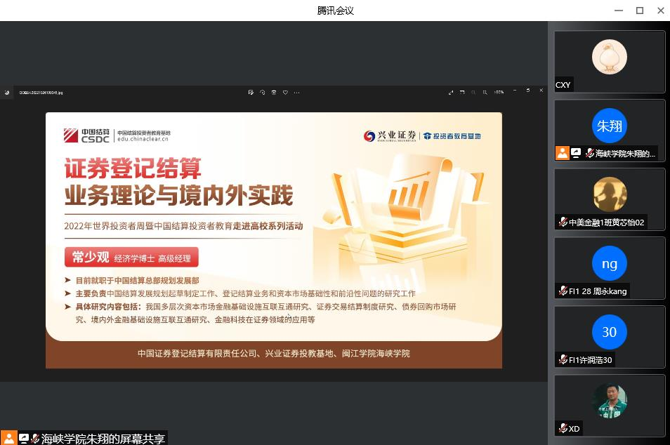 为丰富高校课堂内证券期货知识普及教育内容,发挥投资者教育与保护合力,共同推动投资者教育纳入国民教育体系,10月26日,兴业证券携手中国证券登记结算有限责任公司线上“云”走进福州大学、闽江学院等福建省内高校,开展中国结算投资者教育进高校系列活动。