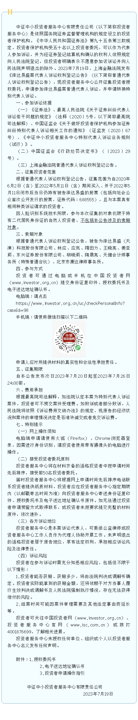 【兴·分享】投服中心 | 关于公开征集泽达易盛案投资者授权委托的公告