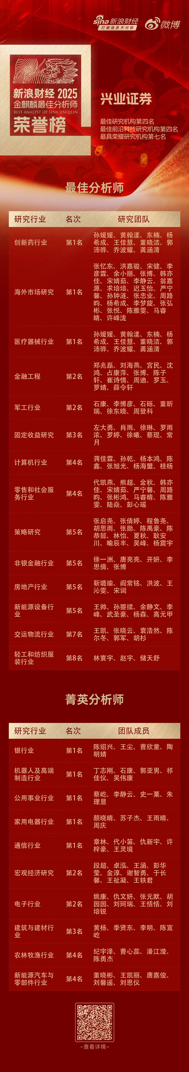 2025年第七届新浪财经金麒麟最佳分析师评选中,兴业证券研究团队共斩获27个奖项,荣获“最佳研究机构”、“最佳前沿科技研究机构”第四名,以及“最具荣耀研究机构”第七名。