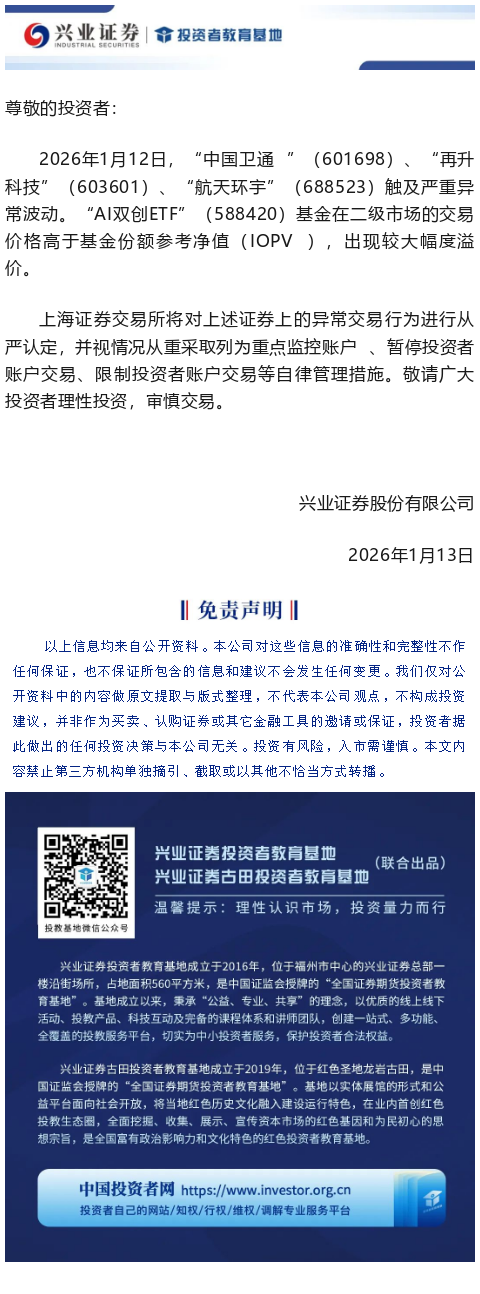 【兴·公告】关于上交所“中国卫通”(601698)等4支重点监控证券交易的风险提示