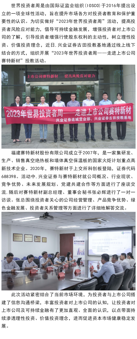 【兴·风采】兴业证券古田投教基地开展2023年世界投资者周——走进上市公司赛特新材活动