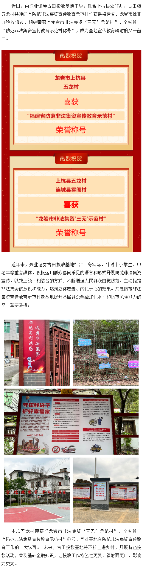 【兴·风采】兴业证券古田投教基地联合上杭县处非办、古田镇五龙村共建的“防非示范村"荣获两大称号