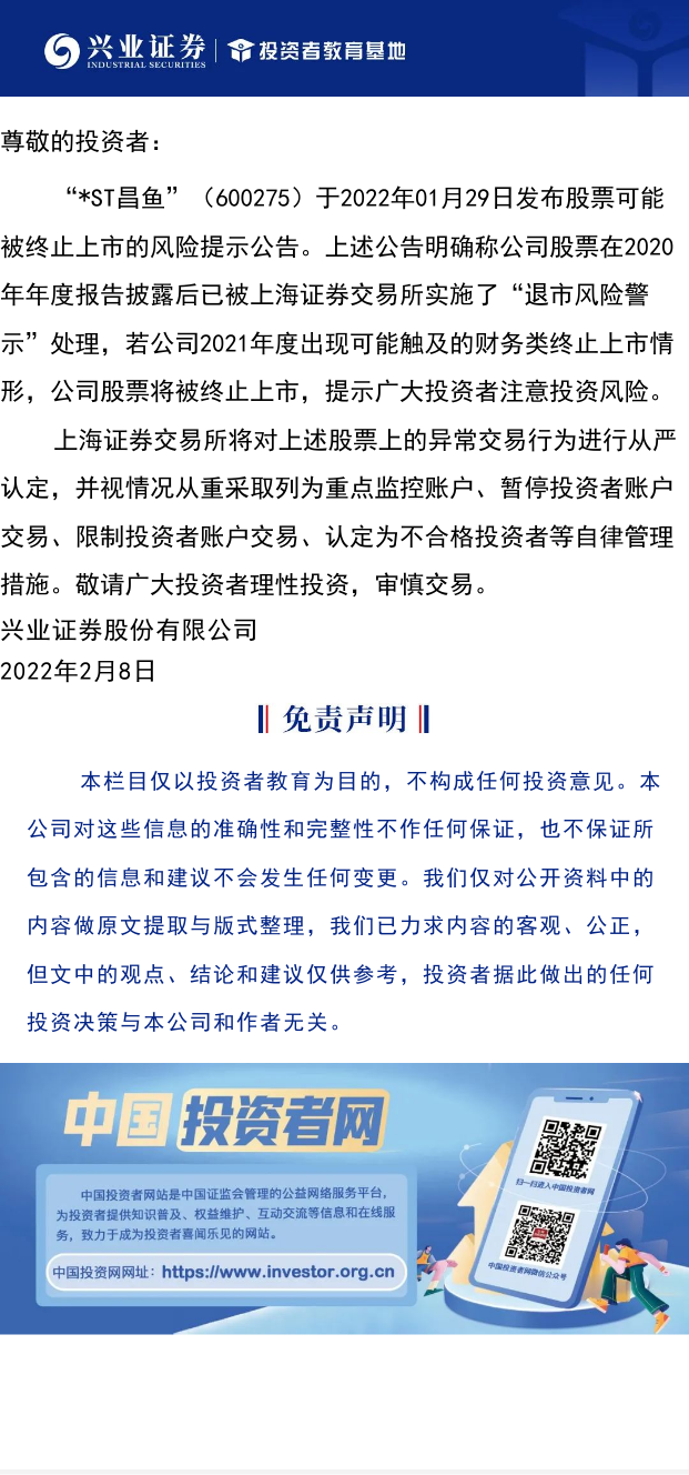 【兴·公告】关于“*ST昌鱼”(600275)股票交易的风险提示