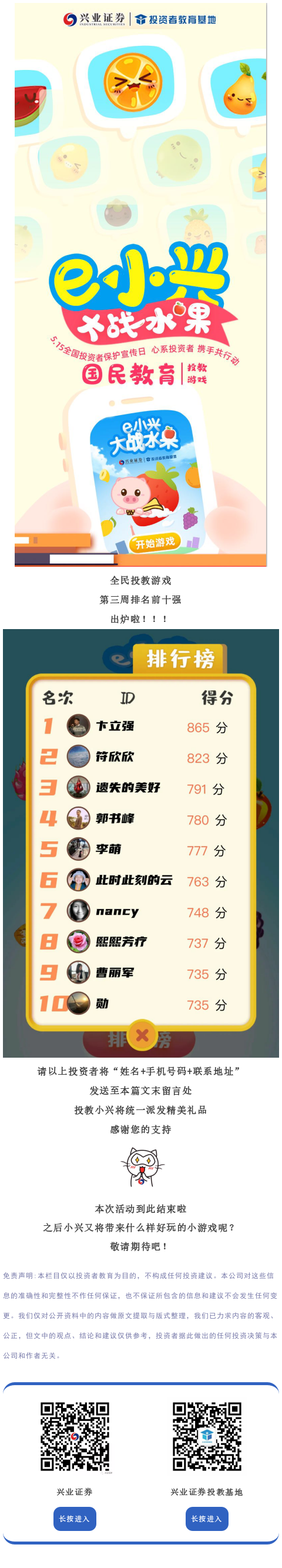 【投教·国民教育游戏】e小兴大战水果第三周排名公布