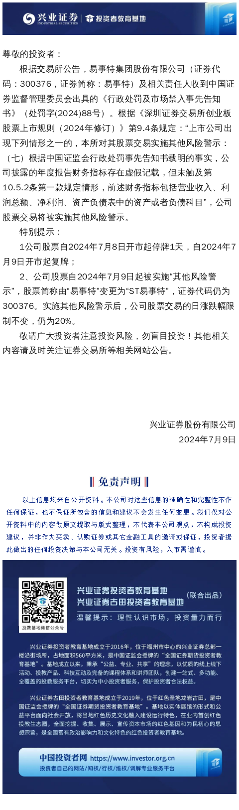 【兴·公告】300376 易事特 关于公司股票交易将被实施其他风险警示暨股票停牌的提示性公告