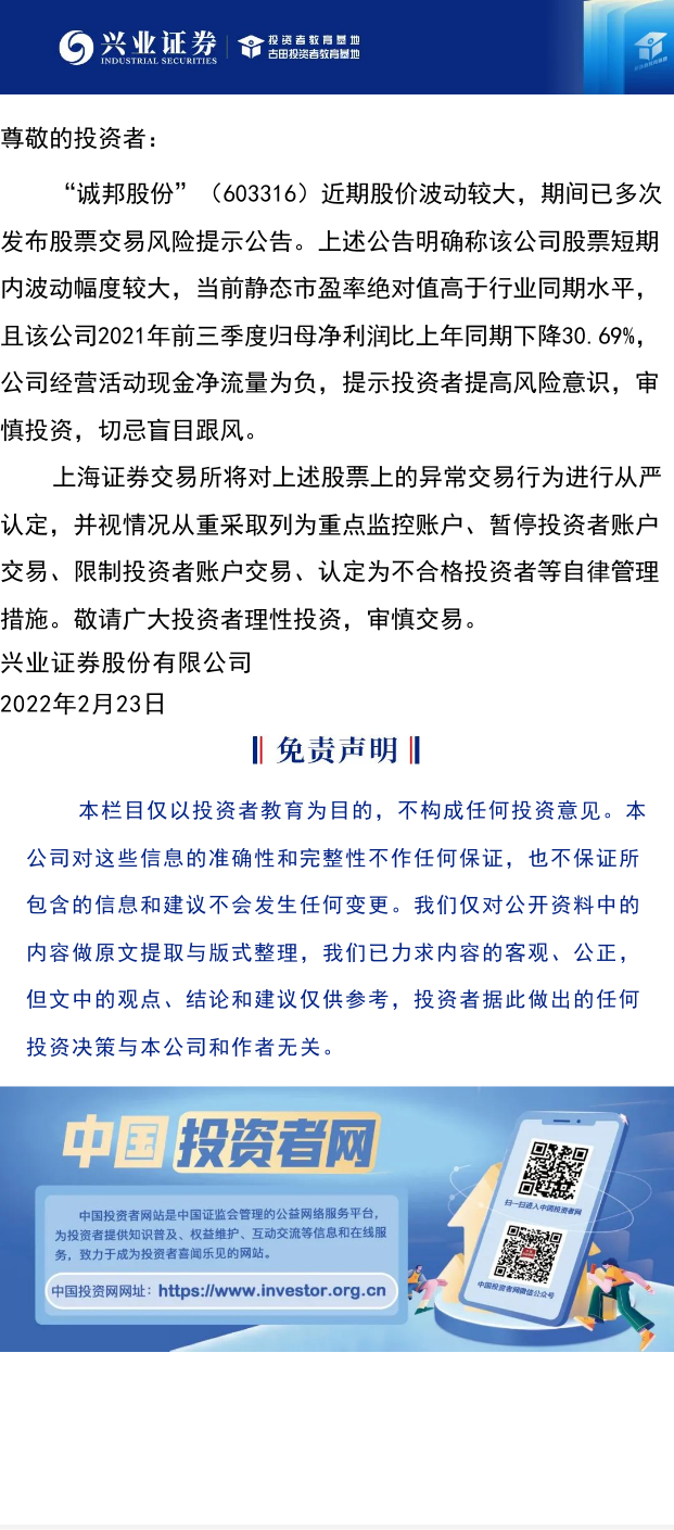 【兴·公告】关于做好“诚邦股份”(603316)股票交易的风险提示