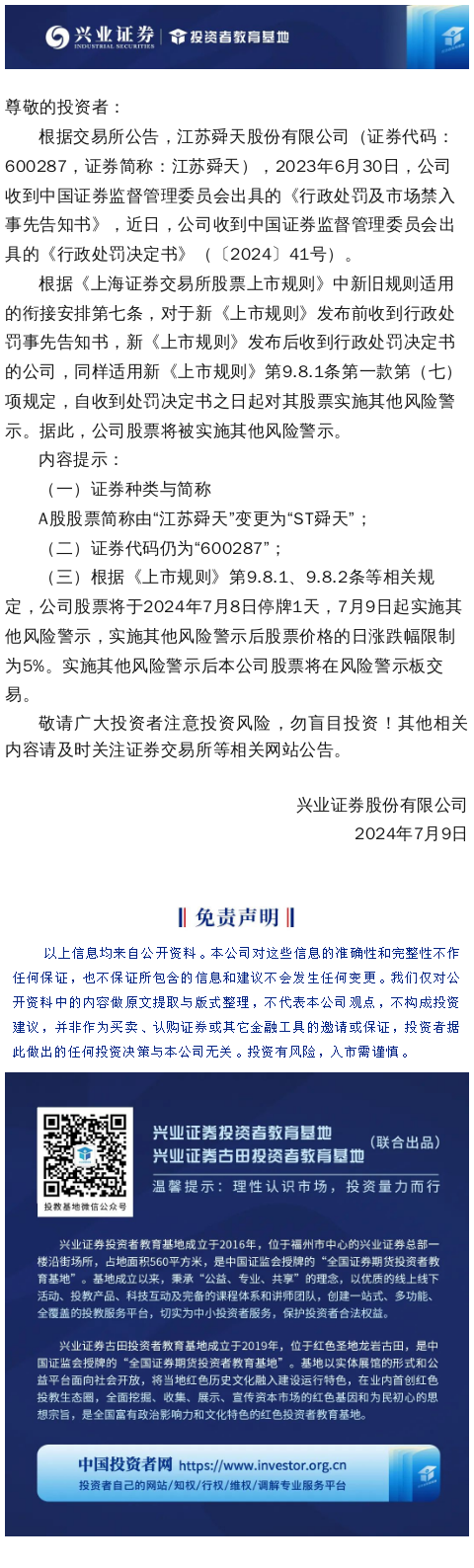 【兴·公告】600287 江苏舜天 关于被实施其他风险警示暨股票停牌的公告