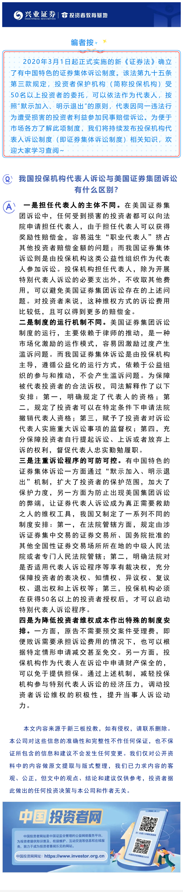 【兴·分享】我国投保机构代表人诉讼与美国证券集团诉讼有什么区别?
