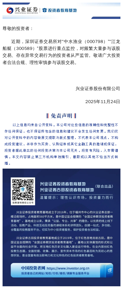 【兴·公告】关于深交所“中水渔业(000798)”“江龙船艇(300589)”重点监控证券交易的风险提示
